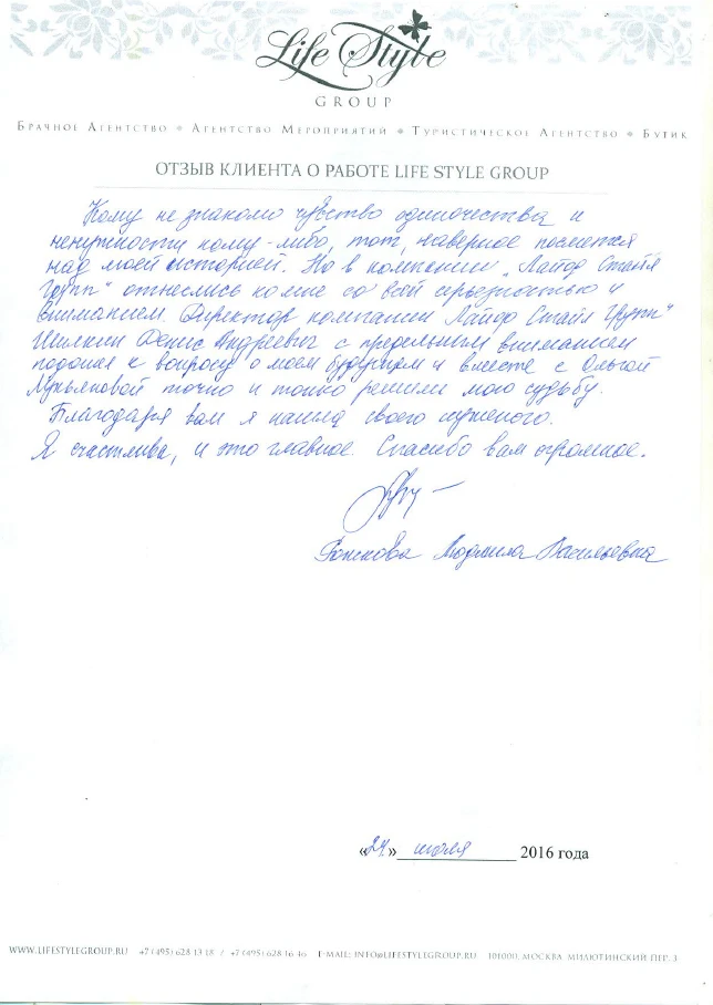 Life Style Group – современная компания свадебной индустрии, отличающаяся от существующих служб знакомств и брачных агентств, собственными эффективными методиками и технологиями, созданными на основе российского и международного опыта в области семейной психологии и коучинга, детальным анализом запросов каждого Клиента и современного рынка услуг, регулярным контролем качества и динамичностью, а также строгой приверженностью к высокими стандартам сервиса, которые позволяют нам быть впереди и превосходить ожидания Клиентов!